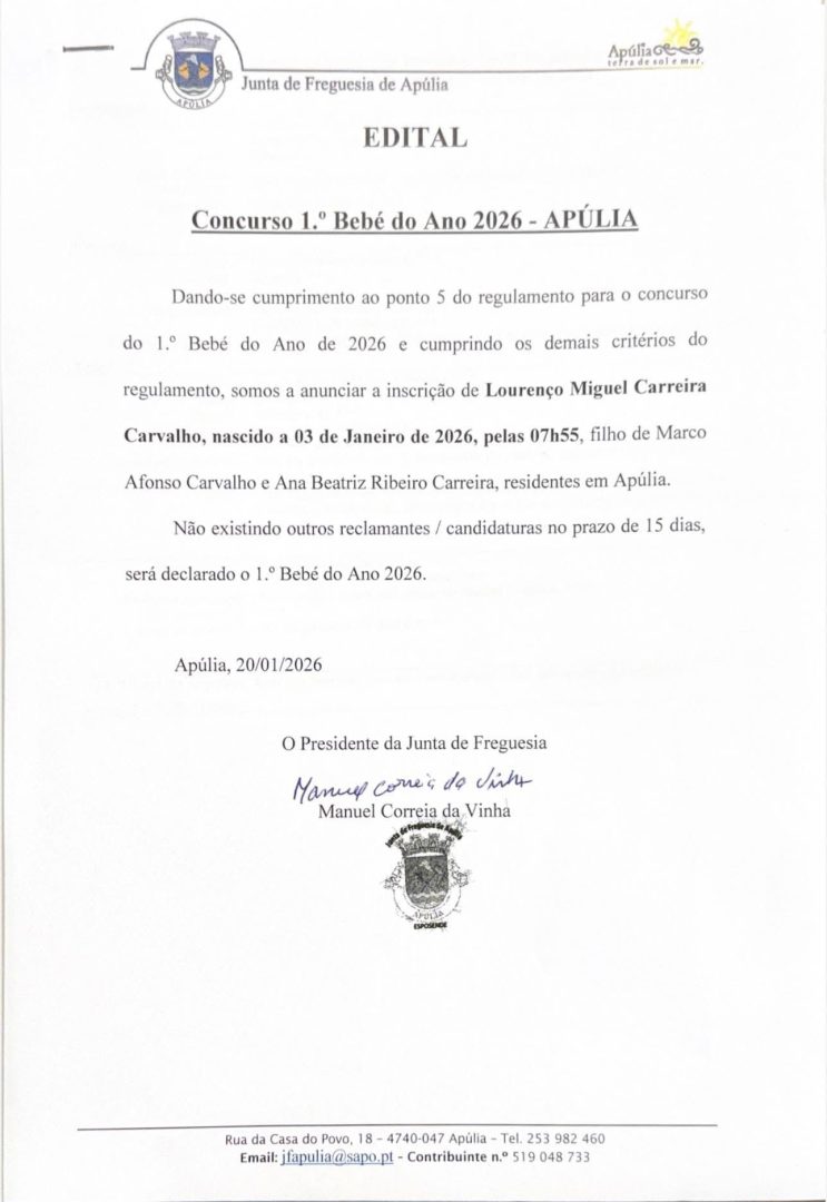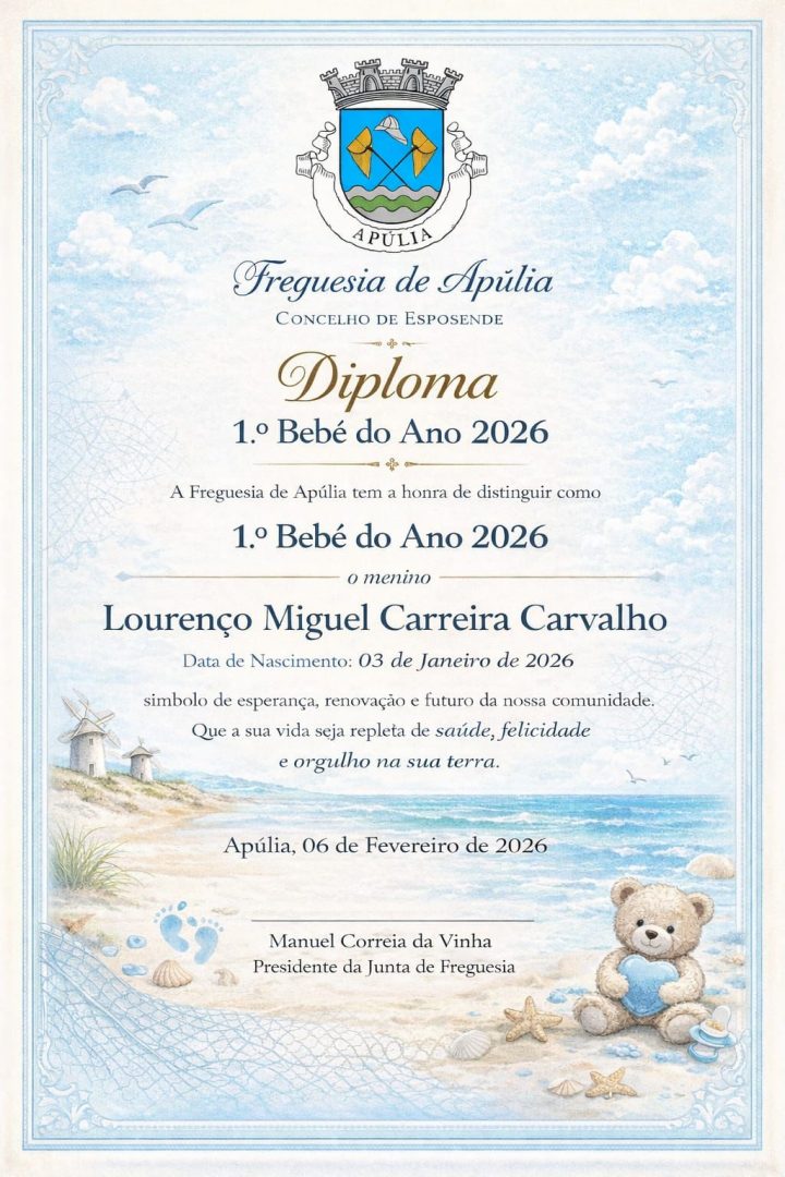 A Junta de Freguesia de Apúlia informa que, nos termos do regulamento em vigor, foi apresentada a candidatura de Lourenço Miguel Carreira Carvalho à distinção de Bebé do Ano 2026.